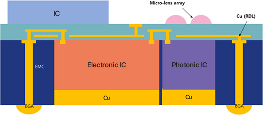It is an O-SiP structure suitable for optical devices in which light enters and exits perpendicular to the surface of the chip. This is the applicable packaging platform when using VCSEL (Vertical Cavity Surface Emitting Laser), PD (Photodiode), APD (Avalanche Photodiode), LED (Light Emitting Diode). There is no limit to the number of electronic devices that can be included, and various digital and analog devices made of Si, SiGe, GaAs, etc. can also be integrated. Each IC is electrically interconnected within the package by a Redistribution Layer (RDL). Standardized BGA (Ball Grid Array) or LGA (Land Grid Array) can be used for external connection terminals. MLA (Micro Lens Array) and Guide Patterns can be manufactured on the surface, which can be manufactured using a semiconductor process that uses photolithography as a wafer level, enabling precise and efficient manufacturing.